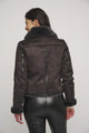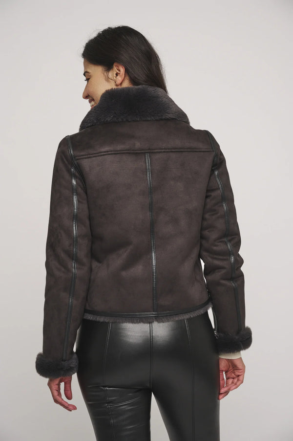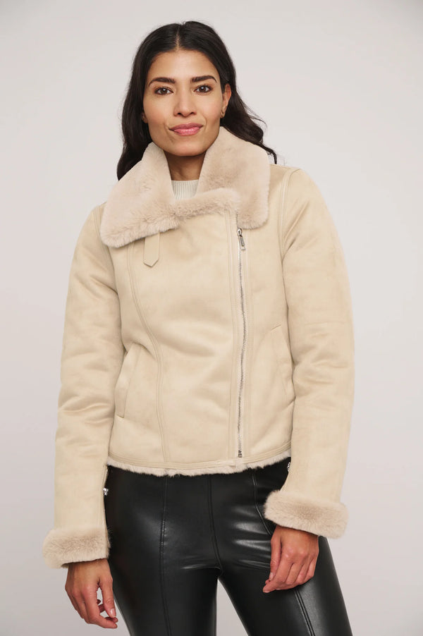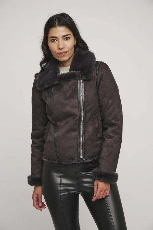 Beautiful biker jacket with a lammy look. This jacket features a faux-fur lapel collar with a strap and buckle, faux-fur cuffs with zipper details, a zipper closure in the front and slash pockets with a push button closure. Its soft faux-fur lining makes this jacket super comfortable to wear.