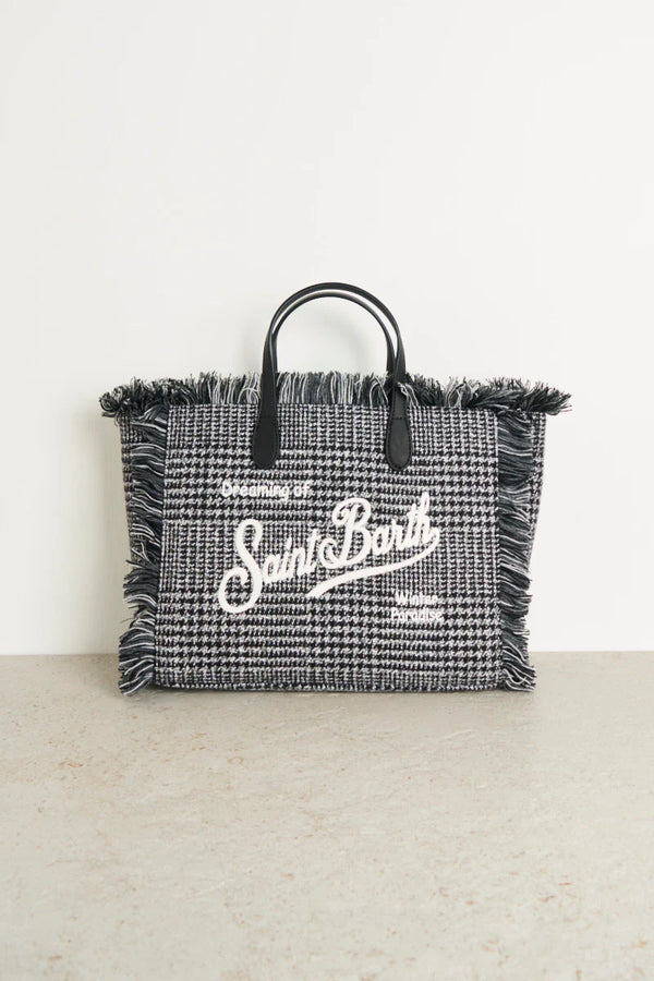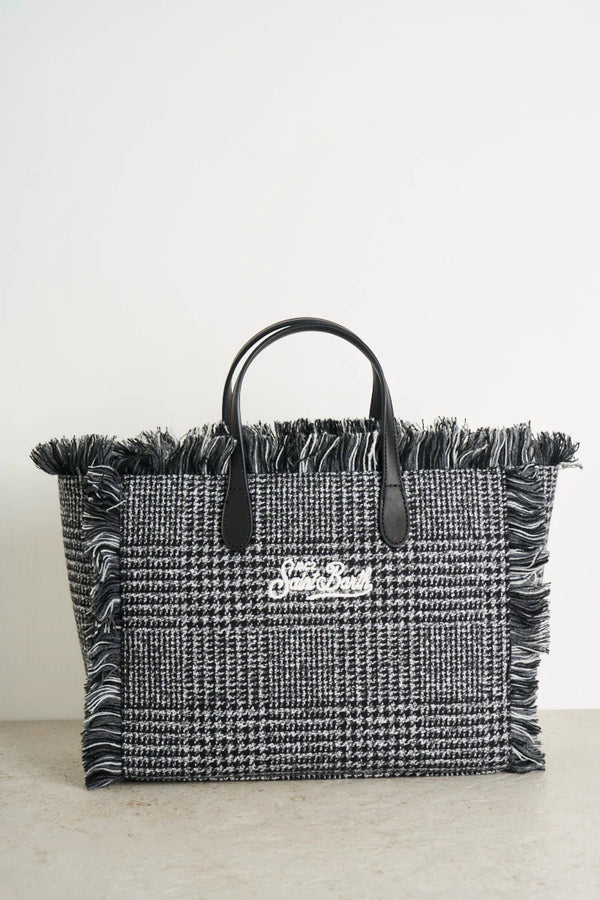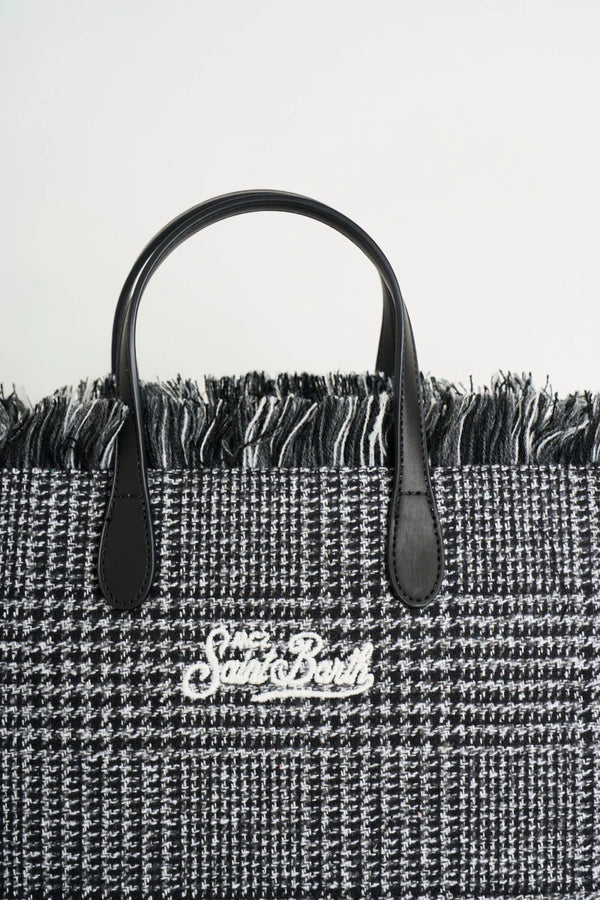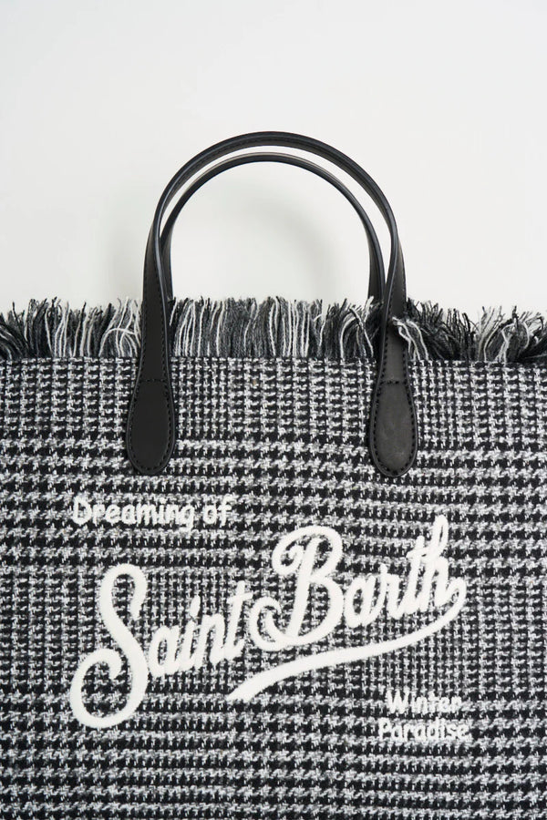 MC2 SAINT BARTH Borsa donna Colette bianca e nera con frange. Logo Saint Barth sul davanti bianco. Tessuto lanoso grigio e nero. Patta interna con zip. Tasca interna con zip. Con tracolla staccabile. Dimensioni: 18 x 16 x 9 cm