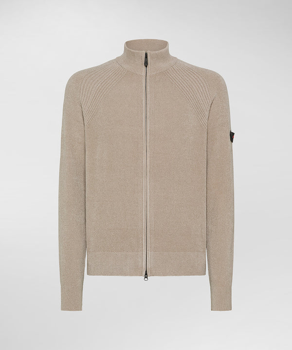 Maglia in ciniglia rasata con zip centrale a doppio cursore, caratterizzata da una mano morbida e da una lucentezza sofisticata. I dettagli a coste su collo in piedi, polsini e fondo valorizzano la costruzione del capo, assicurando una vestibilità confortevole e definita. La personalizzazione con logo Peuterey trilogy, simbolo iconico del brand, è applicata con discrezione sul braccio sinistro tramite bottoncini. Tinta unita, disponibile in più colorazioni. Un capo basic da avere sempre a disposizione nel guardaroba, reso ancora più confortevole dalla morbidezza della ciniglia.
