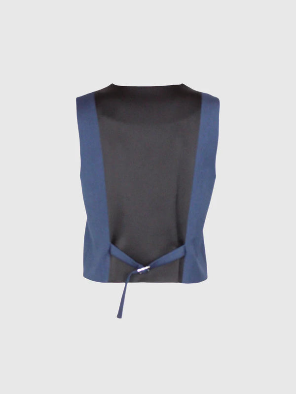 Gilet bicolore realizzato in fresco lana dalle vibes contemporanee e mascoline. Presenta un taglio sartoriale e una fibbia posteriore che consente di regolare la vestibilità.