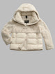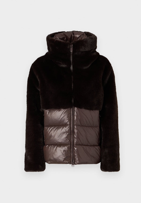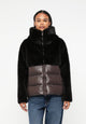 Giubbetto in ecopelliccia nella parte superiore e in nylon lucido nella parte inferiore. Caldo cappuccio ed impuntura sotto a righe orizzontali; capo pensato per proteggere dagli inverni più rigidi senza rinunciare allo stile.