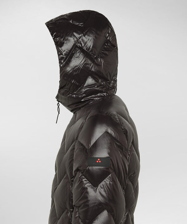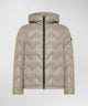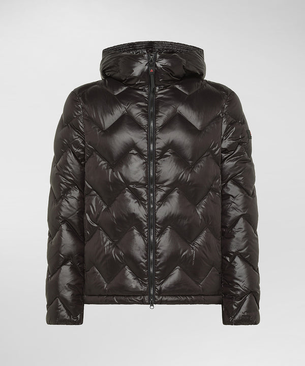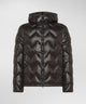 Piumino corto in nylon super leggero, caratterizzato da una particolare lucentezza e da una mano fluida e morbida. La trapunta a motivo chevron, dinamica e grafica, dona al capo un carattere distintivo. Parte della linea Color in cui i disegni geometrici prendono vita ed esaltano i piumini della sezione, un concept giocoso e ironico che reinterpreta il capospalla in modo creativo ed easy. L’imbottitura in piuma naturale certificata garantisce calore e leggerezza ideali durante la stagione fredda. Il cappuccio fisso regolabile, la full zip centrale a doppio cursore e i dettagli neri a contrasto completano un look dinamico e moderno. Parte della linea Color, questo piumino, wind resistant e water repellent, interpreta il capospalla in modo creativo e giocoso, con un’estetica distintiva e immediata, ideale per chi non ama passare.