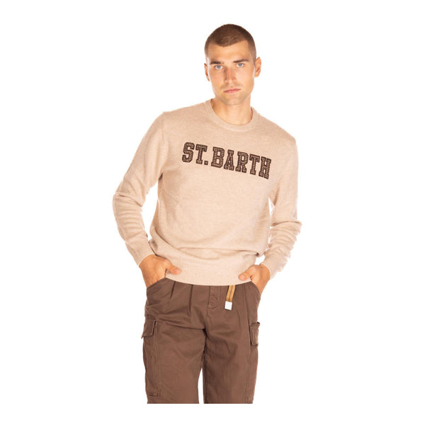 Maglione da uomo girocollo con grande logo Saint Barth in tessuto pied de poule, fondo collo e polsini a costine. Vestibilità regolare. Logo St. Barth sulla manica.