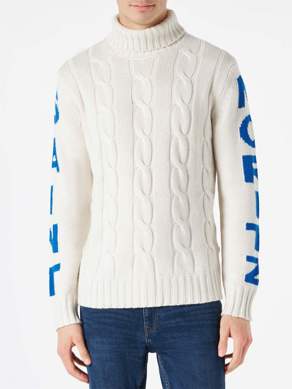 Dettagli: Maglione MC2 SAINT BARTH cielo e panna con collo tondo, maniche lunghe e stampa frontale con scritta Off Piste.