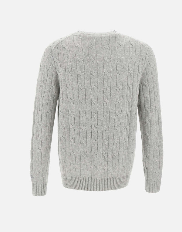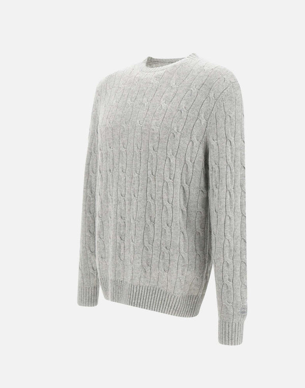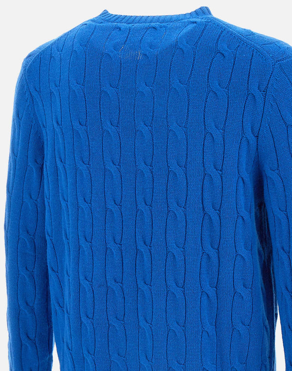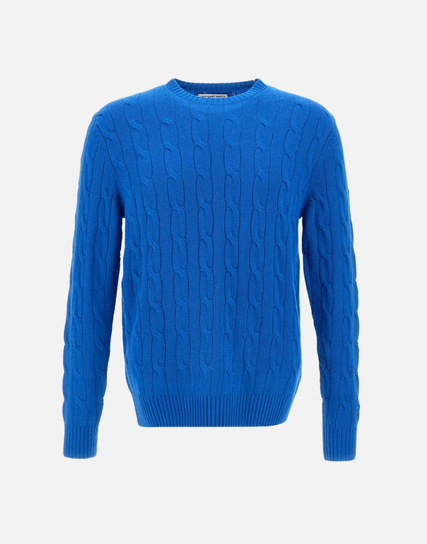 Maglia uomo Mc2 Saint Barth "Regent" in misto lana e cashmere, blu cobalto, lavorazione a trecce, maniche lunghe, girocollo, bordi a costine, logo a ricamo sul petto, regular fit.