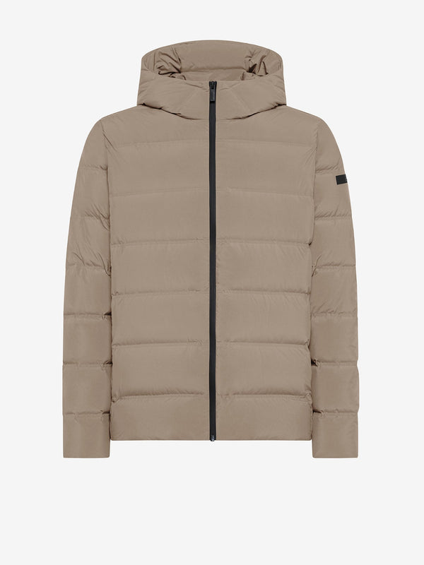 Il piumino di lunghezza media e dal fit regolare è caratterizzato dalla texture senza soluzione di continuità dei canali tubici dal touch morbido e consistente, che contengono l'imbottitura in piuma d'anatra 90/10. La costruzione ad alta densità è rinforzata dalle nastrature interne. Sul davanti, la zip spirale spalmata nera solca il pattern orizzontale del tubico da 10 cm, fino ad assicurare il collo alto e protettivo e il cappuccio avvolgente fisso. Le tasche laterali sono provviste di zip invisibile, mentre l'interno è dotato di un taschino con zip invisibile, impreziosito dal doppio filetto arancione e dalla tag a cuore "Made with love, designed in Tuscany". Il logo a microiniezione nero sulla manica sinistra firma un capospalla perfetto per tutti coloro che cercano calore e leggerezza in ogni situazione.