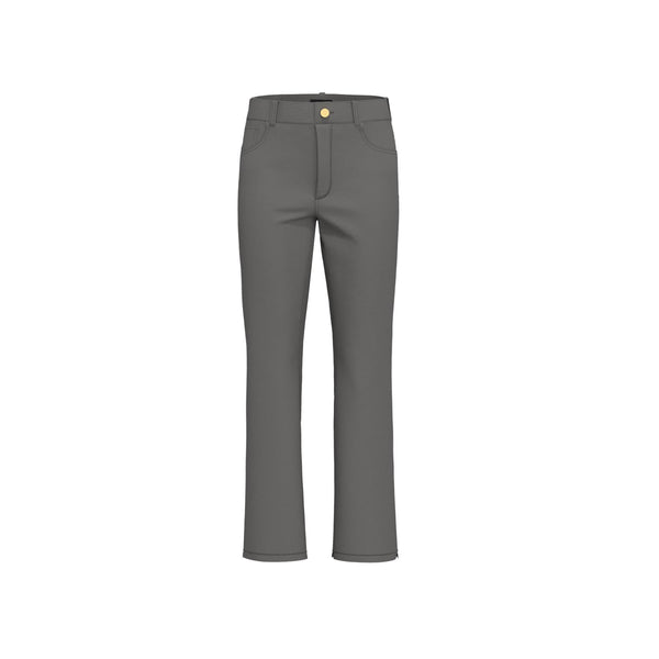 Pantaloni cinque tasche in gabardine stretch, linea slim flare. Chiusura con bottone personalizzato e zip nascosta. Salpa in pelle sul retro con logo. Lunghezza 95 cm.