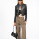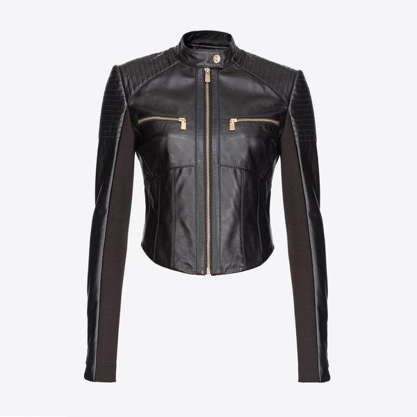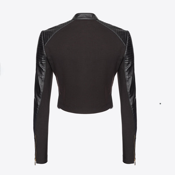 Giubbino in pelle stile biker dal taglio crop in pelle con inserti in tessuto tecnico di viscosa stretch sul retro e nella parte inferiore delle maniche. Piccolo colletto in piedi con bottone, e bustino dal design a bustier con taschini e polsini con zip in metallo. Chiusura con zip frontale.