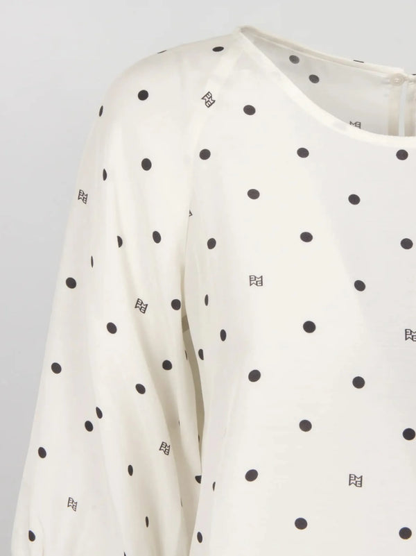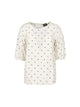 Blusa in viscosa a fantasia, linea dritta. Scollo rotondo, maniche raglan a tre quarti. Chiusura a goccia con bottone sul retro. Lunghezza 60 cm.