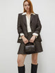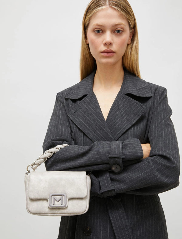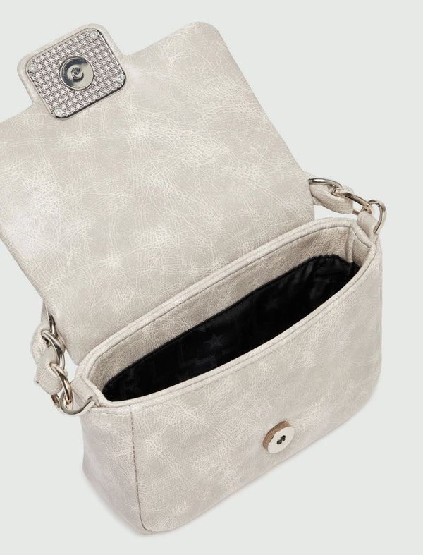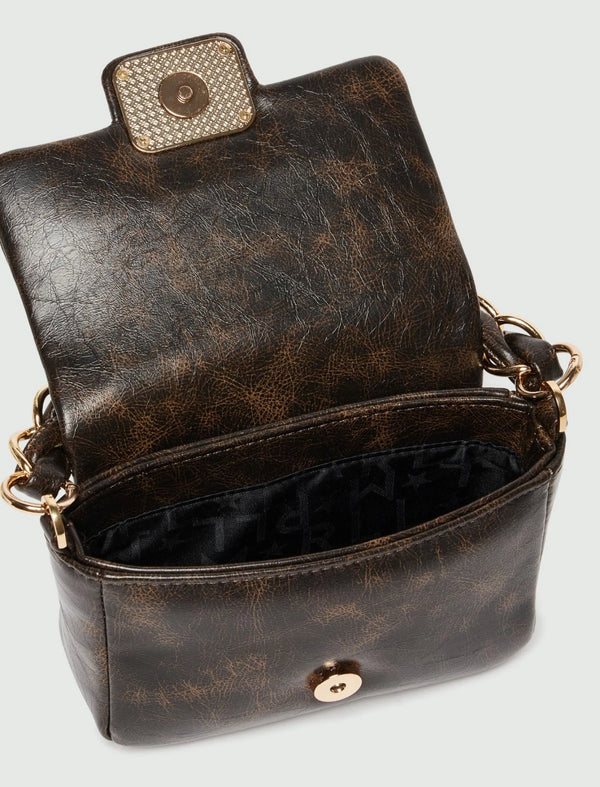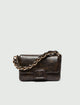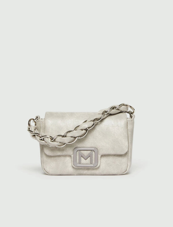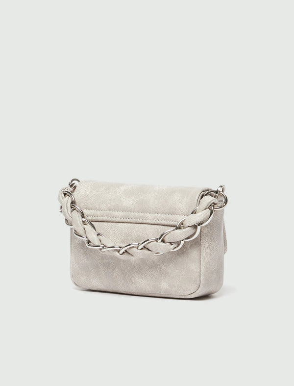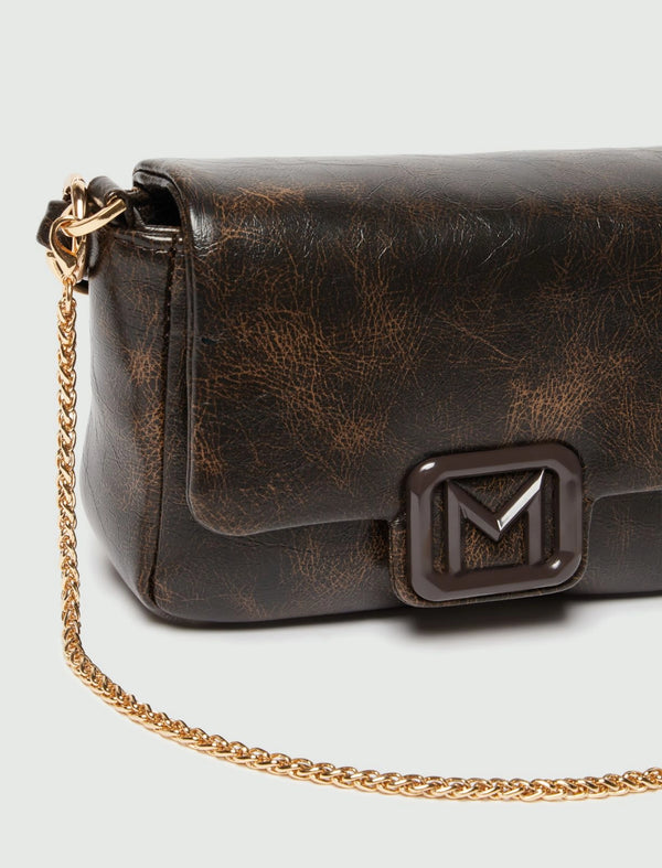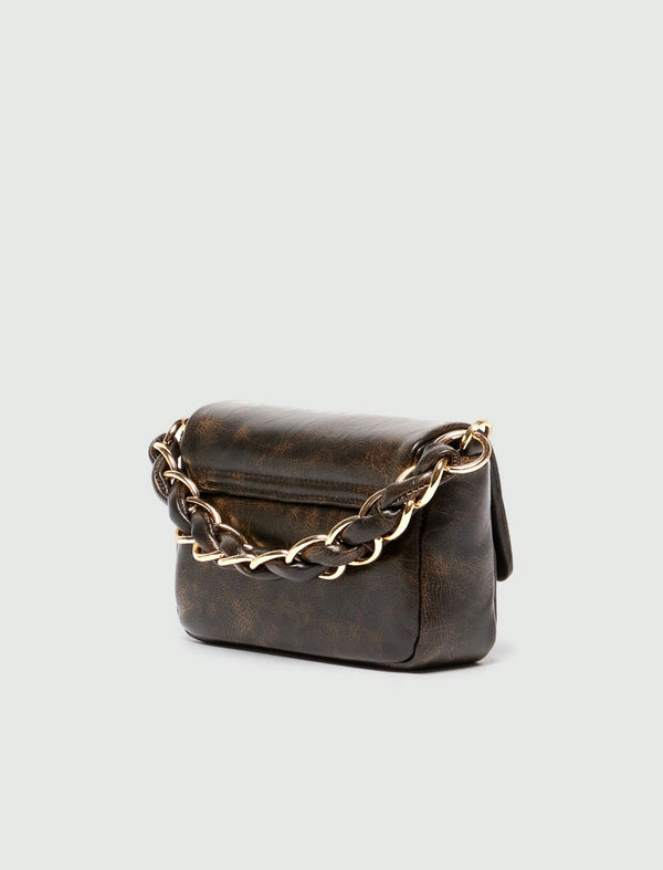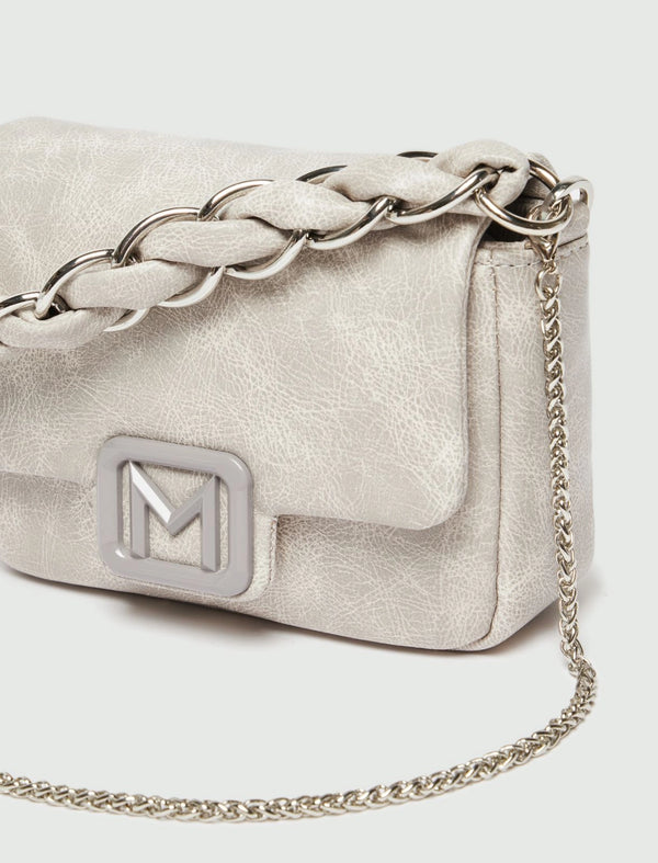 Borsa in materiale sintetico effetto invecchiato leggermente imbottita con logo in tinta. Manico a catena intrecciato, tracolla a catena amovibile. Chiusura con patta e calamita nascosta, taschina interna portatessere. Fodera logata. Dimensioni: