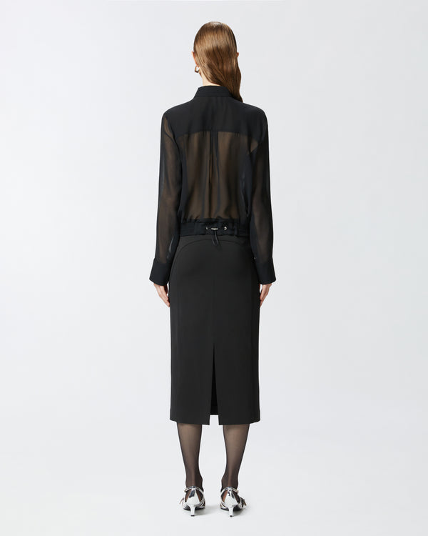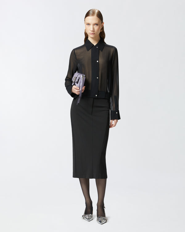 Camicia da donna realizzata in leggerissima georgette e caratterizzata da una particolare silhouette che ricorda le giacche bomber: taglio corto, maniche a giro con polsino, elastico a fondo capo e chiusura con patta e bottoni automatici in metallo. Il dettaglio di coulisse regolabile inserita a fondo capo, visibile sul retro, permette di raccogliere maggiormente il volume, per personalizzare la portata della camicetta. Il capo reinterpreta con originalità e stile un classico del guardaroba come la camicia da donna, dando ancora più carattere ai tuoi look primaverili.