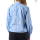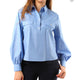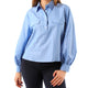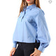 - Design: Collo a polo con bottoni a vista, taschine con patta sul petto, maniche a palloncino con dettagli arricciati ai polsi.