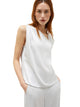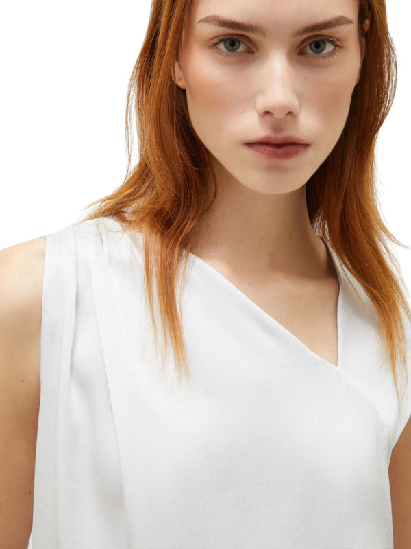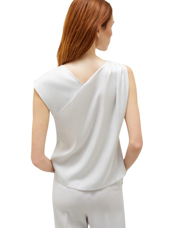Top in satin tecnico, vestibilità scivolata. Scollo asimmetrico con intreccio sulla spalla destra e manica sinistra leggermente scesa.