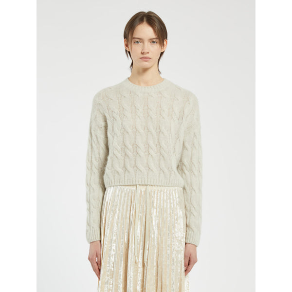 Pronta ad accoglierti in un morbido abbraccio: la maglia a trecce si rinnova con proporzioni cropped, per una silhouette dinamica e sensuale. Al tempo stesso calda, leggera e avvolgente.