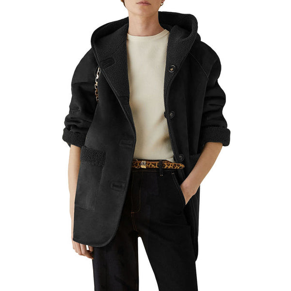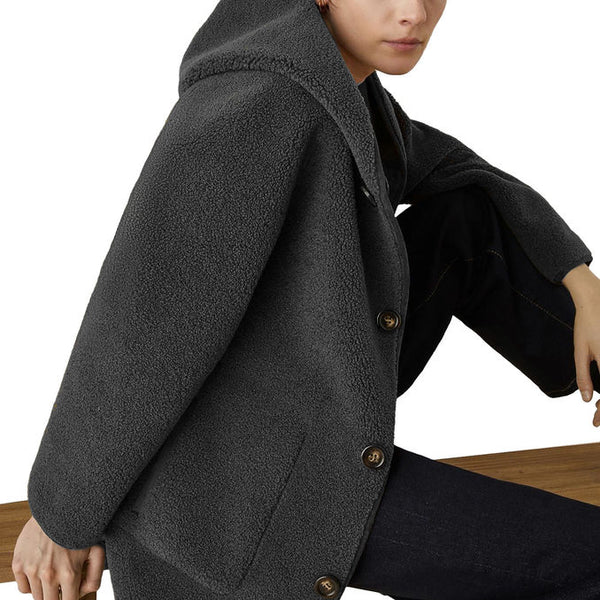 Caban a maniche lunghe reversibile realizzato in tessuto morbido e teddy dalla linea dritta. Presenta collo con cappuccio, maniche lunghe, chiusura con bottoni a vista, tasche applicate da un lato e a filetto sull'altro.