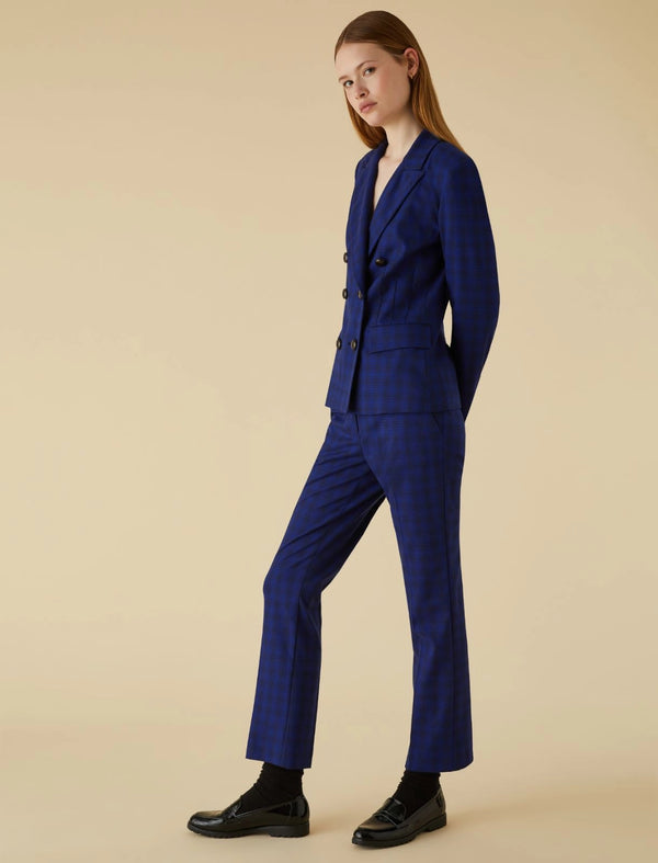 Pantaloni caddy elasticizzati svasati. Chiusura con zip coperta da patta e gancetto, oltre a tasche alla francese davanti e a filetto dietro. Dettaglio piega stirata davanti e dietro.