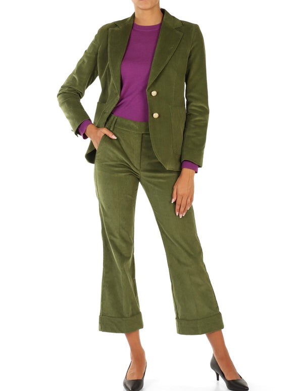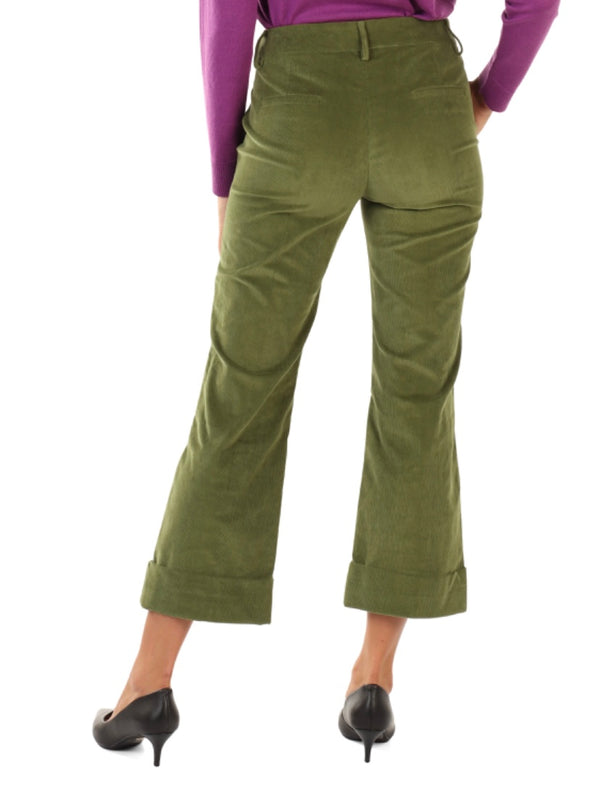Pantaloni a gamba larga in tessuto tinto filo. Pinces in vita e chiusura con zip coperta da patta e bottone. Tasche laterali in cucitura e tasche posteriori a filetto