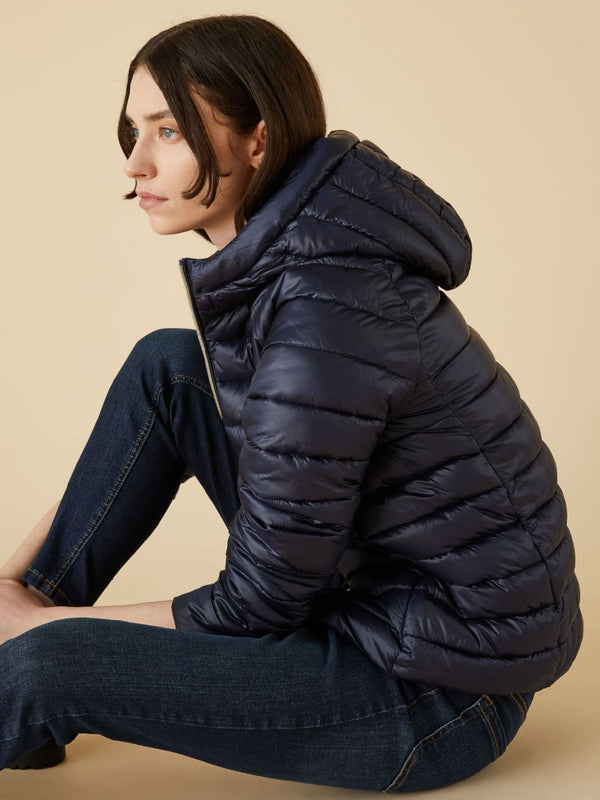 Giubbotto trapuntato con cappuccio. Tasche laterali, chiusura full zip centrale e fondo regolabile.