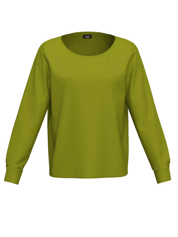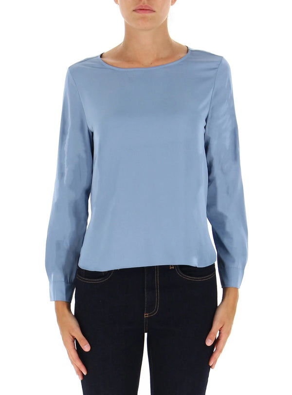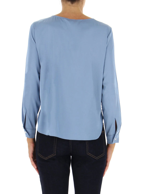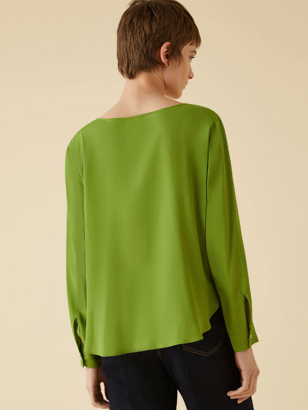 Camicia dritta in crepe de chine di misto seta. Collo a camicia e maniche lunghe impreziosite da polsini. Chiusura con bottoni nascosti e tasche sul petto applicate con patta. Il tessuto contiene materie prime derivate dalla cellulosa del legno; una fibra ottenuta in a