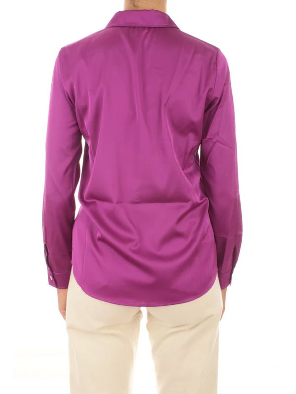 Camicia dritta in crepe de chine di misto seta. Collo a camicia e maniche lunghe con risvolto. Chiusura con bottoni nascosti e tasche applicate.