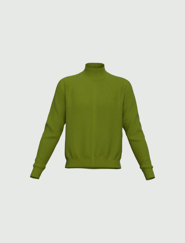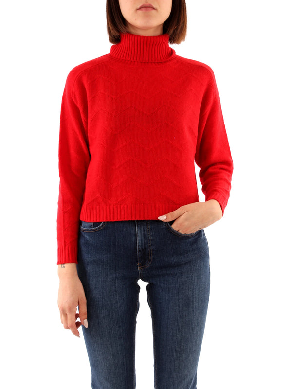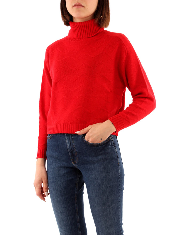 Maglia in misto lana merinos a mix di punti, linea dritta. Collo alto a cratere, maniche lunghe con polsino.