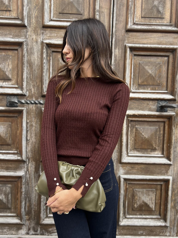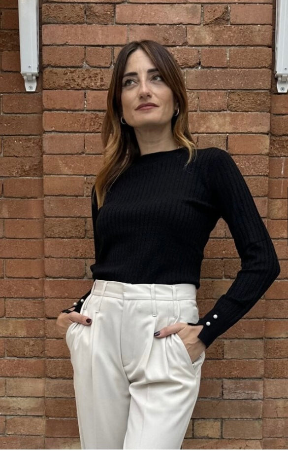 Maglia con perle Yale di Emme di Marella. Maglia girocollo a maniche lunghe con ricami. Dettaglio perle sui polsi. Disponibile in panna, bordeaux e nero.