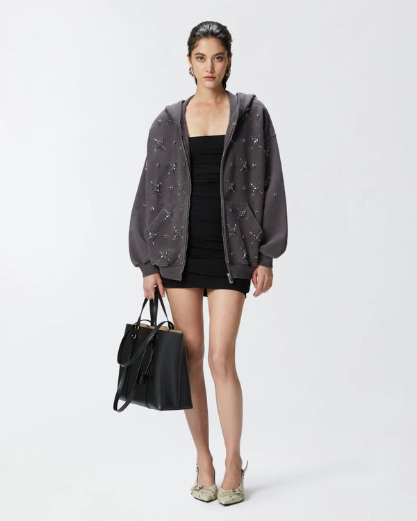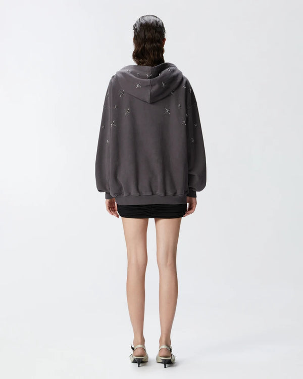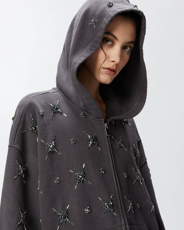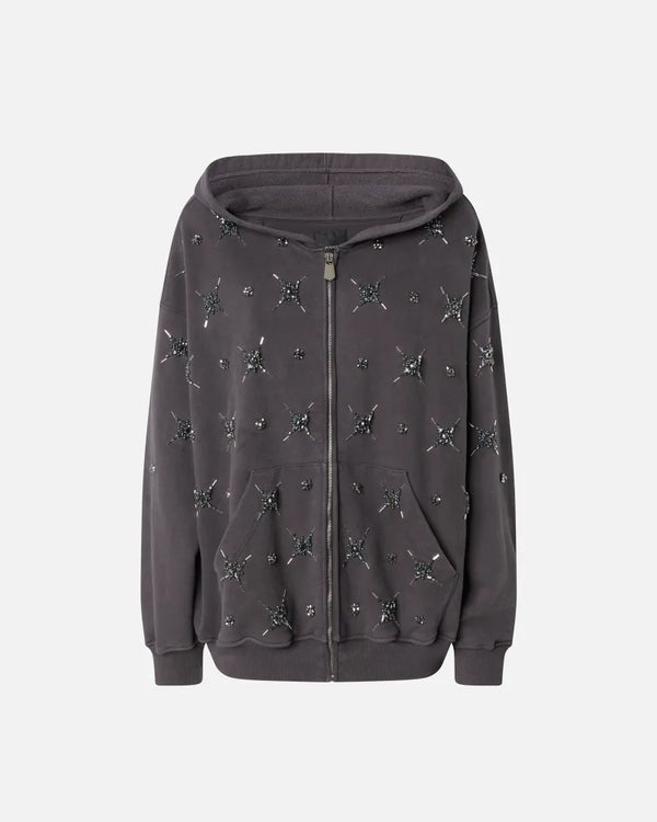 Felpa con cappuccio da donna realizzata in morbido cotone tinto in capo, caratterizzato da un particolare finishing old, effetto vintage, completato da un prezioso ricamo gioiello con cristalli e perline. La felpa, con doppia tasca a marsupio e zip metallica davanti, è un prezioso update alla classica felpa quotidiana, ed è capace di trasformare il tuo look casual con un tocco davvero originale.