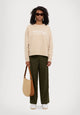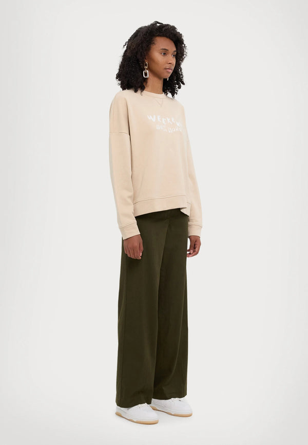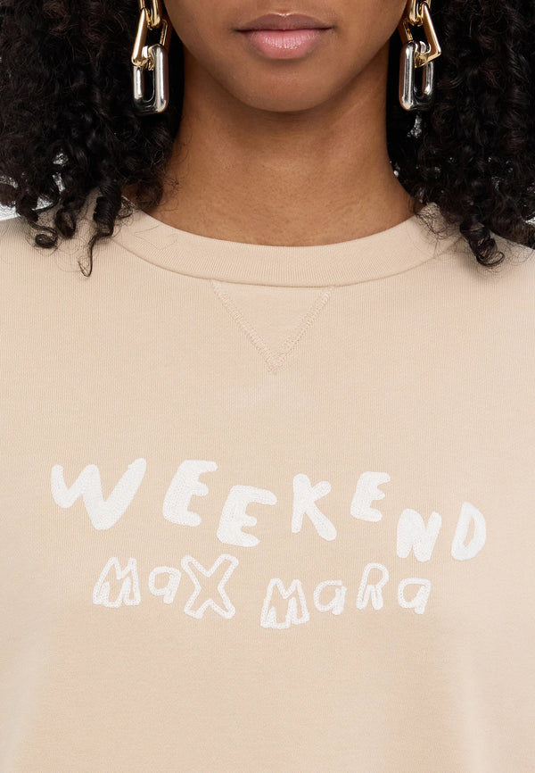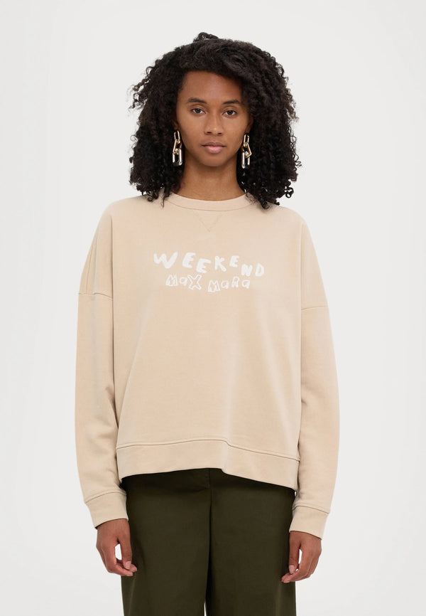 Felpa a maniche lunghe dal volume oversize, realizzata in morbido jersey di puro cotone. Modello girocollo, rifinito con sprone a punta ricamato sul davanti, spalla scesa e scritta Weekend Max Mara ricamata sul davanti.