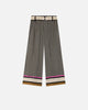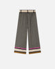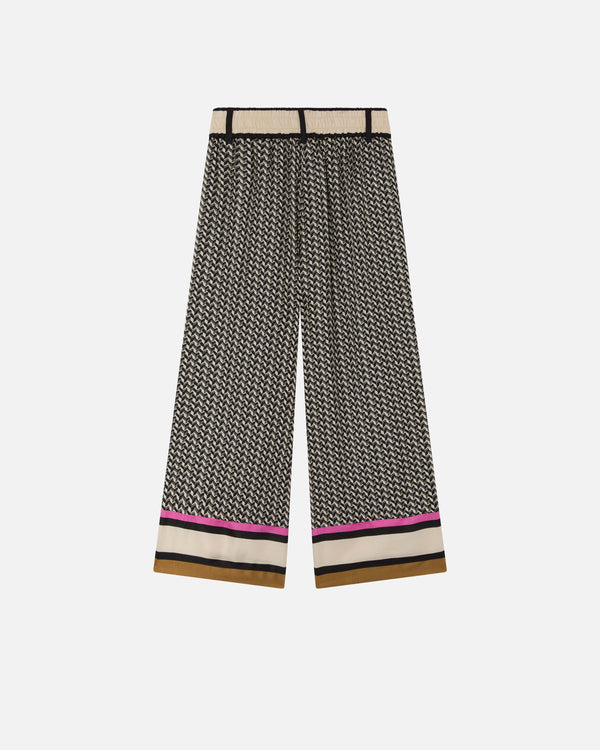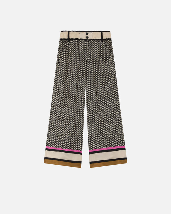Pantaloni lunghi da donna in leggero tessuto twill di viscosa caratterizzati da una particolare stampa foulard all-over e dettaglio a righe color block a fondo capo. Linea morbida, con vita alta completata da inserto elastico e passanti per cintura e tasche sui fianchi, Chiusura con zip e doppio bottone.