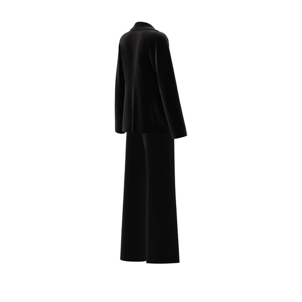 Completo blazer e pantaloni in ciniglia stretch. Blazer dritto, collo a rever, maniche lunghe. Chiusura con bottone, tasche con patta. Pantaloni dritti a vita alta con zip invisibile sul fianco.