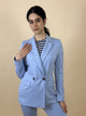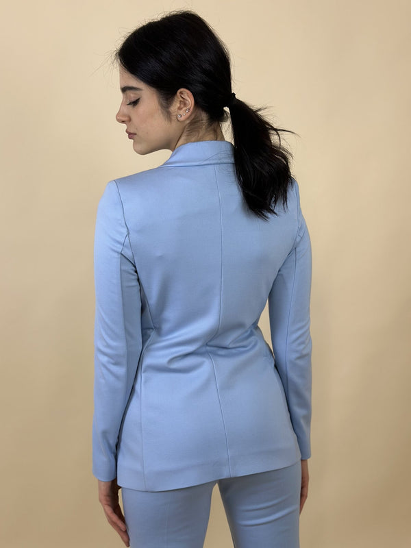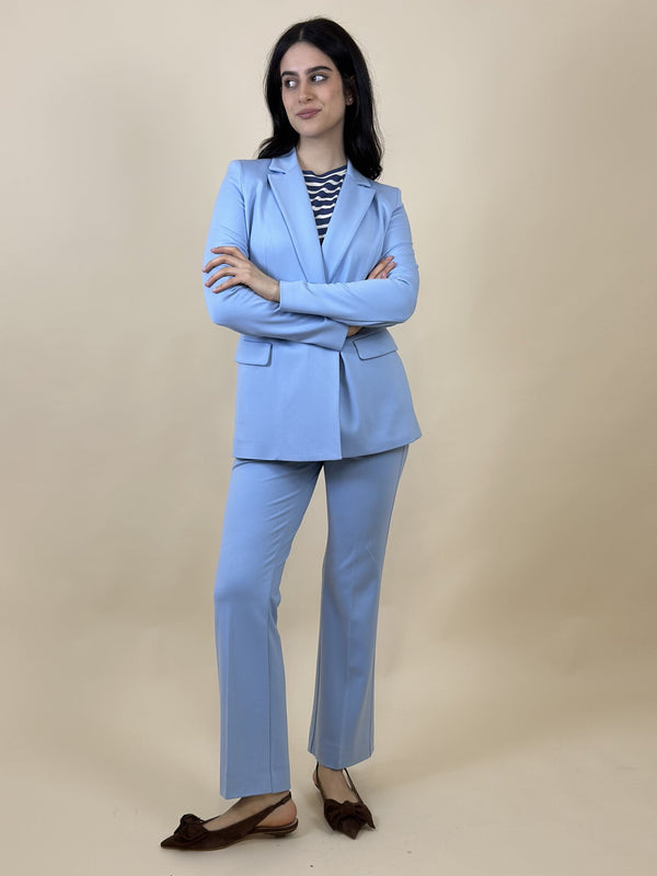 Giacca doppiopetto Gemma di Emme Marella. Giacca doppiopetto con due bottoni, modello sfiancato con collo reverse. Tessuto jersey stretch. Foderata. Da abbinare al pantalone Flare. Disponibile in azzurro.