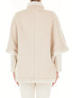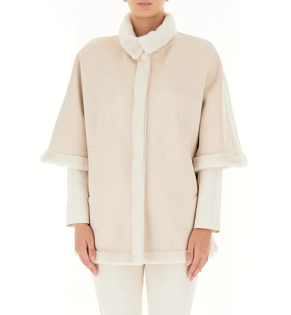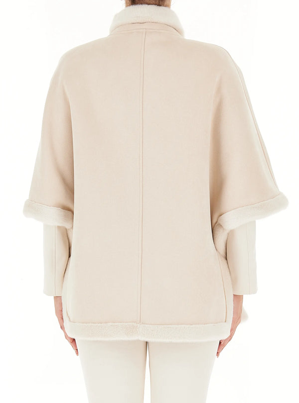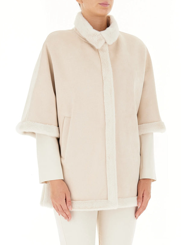 Giacca monopetto con colletto, interno e bordi in finta pelliccia, chiusura frontale con bottoni a pressione nascosti, mezza manica ampia, due tasche sul davanti