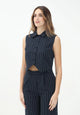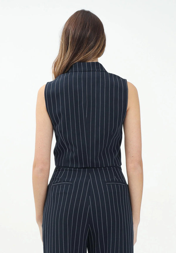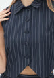 VICOLO Gilet blu da donna con un collo alla camicia e bottoni centrali. Il capo è caratterizzato da una linea aderente e da un taglio a metà sul davanti, che crea un'apertura nella parte centrale del top. Il tessuto è a righe sottili bianche, dando un aspetto elegante e fresco. Il gilet si abbina perfettamente a pantaloni coordinati con lo stesso pattern, creando un completo dallo stile moderno e chic. La modella indossa una taglia S ed è alta 170cm. Si consiglia un lavaggio ed una stiratura a media temperatura. Stagione primavera estate.