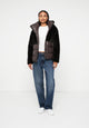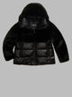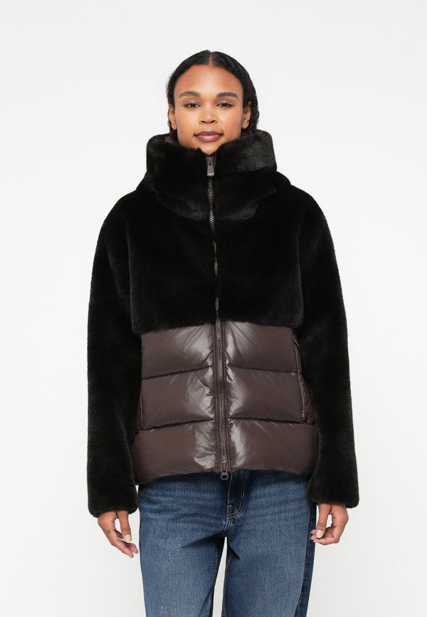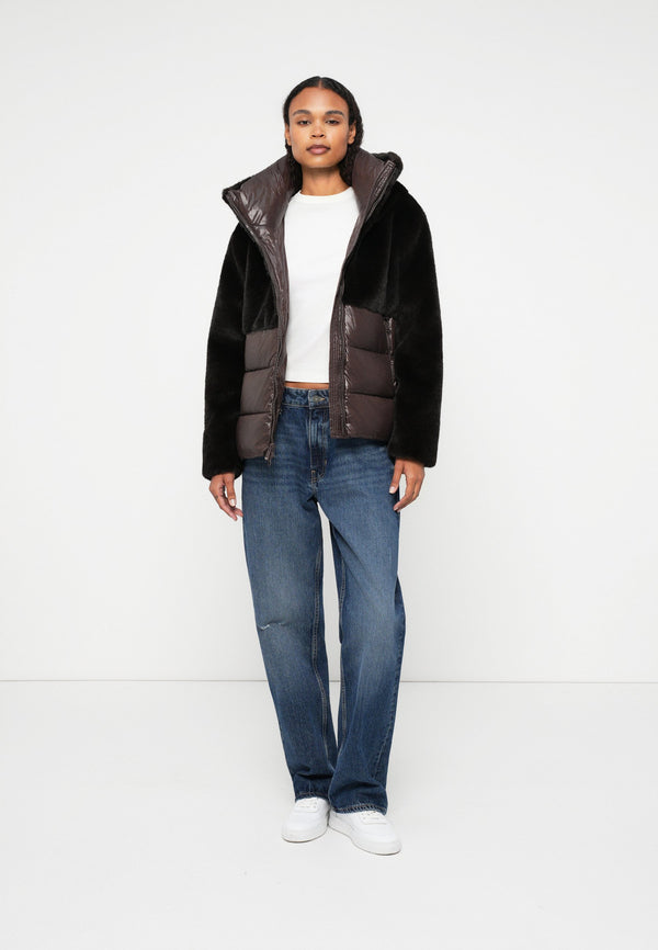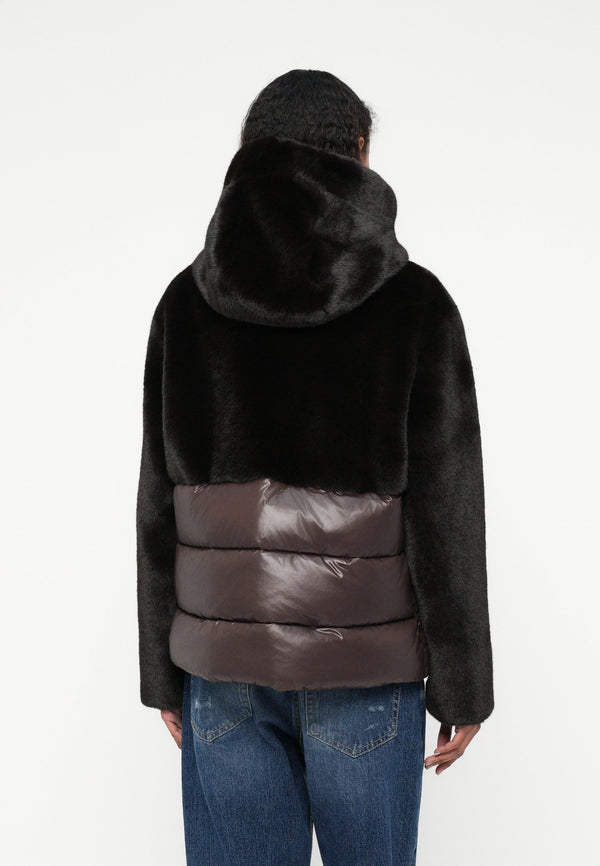 Giubbetto in ecopelliccia nella parte superiore e in nylon lucido nella parte inferiore. Caldo cappuccio ed impuntura sotto a righe orizzontali; capo pensato per proteggere dagli inverni più rigidi senza rinunciare allo stile.