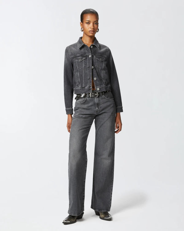 Giubbino in denim dark grey, caratterizzato da un lavaggio vintage grigio scuro. Colletto piccolo a camicia, maniche lunghe con bottone al fondo, taschini applicati con patta a punta e tasche a filetto verticale sui fianchi. Il capo è caratterizzato da motivo di impunture verticali, che rendono il design iconico. Chiusura con bottoni a chiodo in metallo davanti.