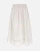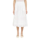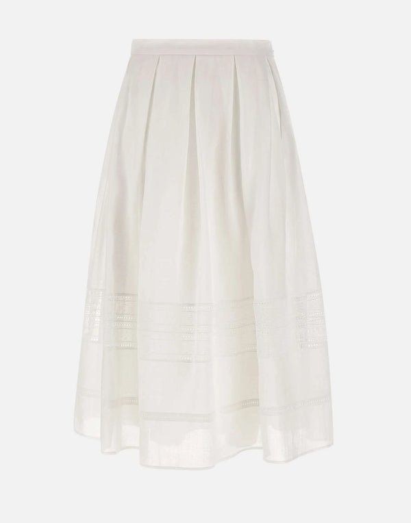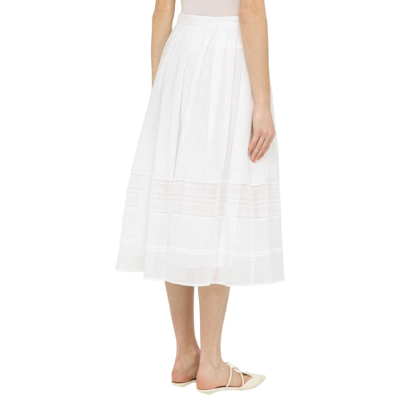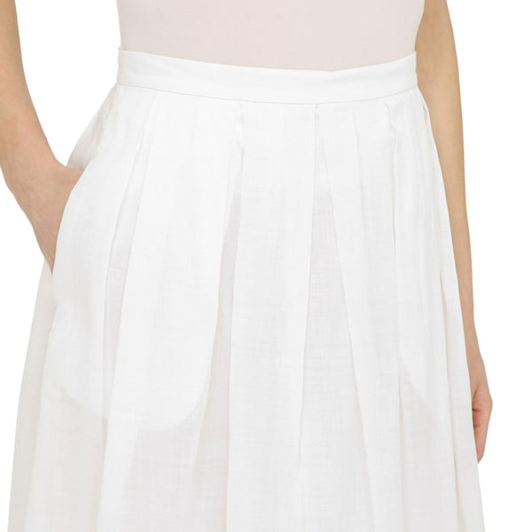 Gonna Max Mara Studio "Patto" in ramiè, colore bianco, tessuto extrafresco e morbido al tatto e all'indosso, fibra naturale ed ecosostenibile, foderata in cotone, inserto ad uncinetto super femminile, zip laterale, tasche laterale a filetto, perfetta per la bella stagione, regular fit.