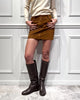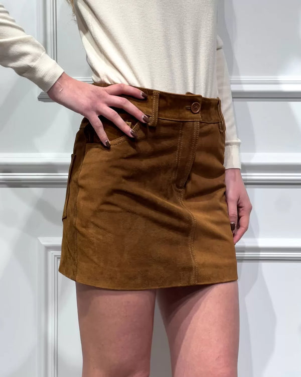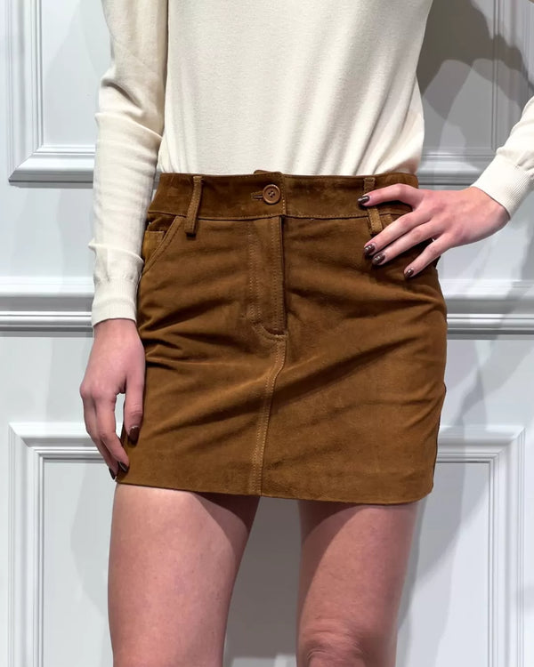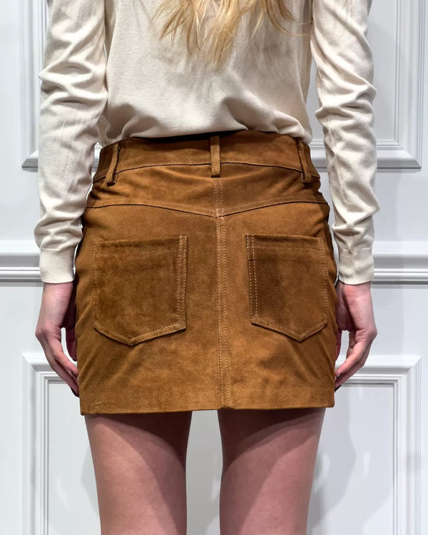 Il suede è il trend di stagione e questa minigonna in vera pelle lo esprime con eleganza e carattere. Perfetta da abbinare sia al blazer che al bomber in coordinato per un look sofisticato e di tendenza!