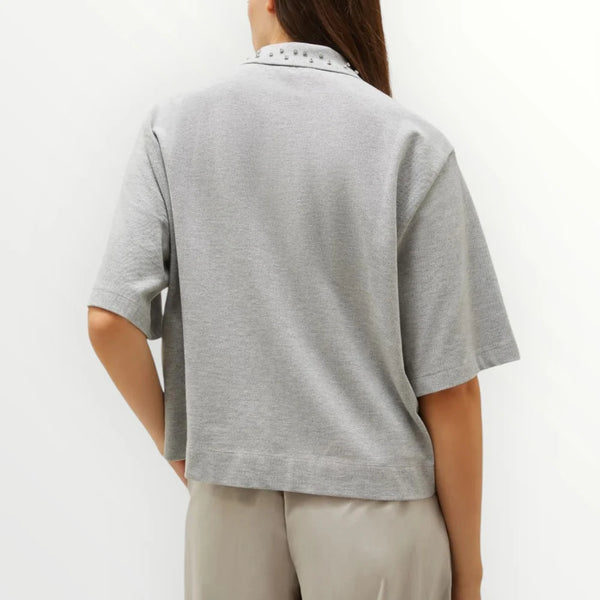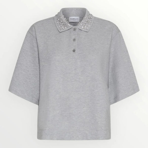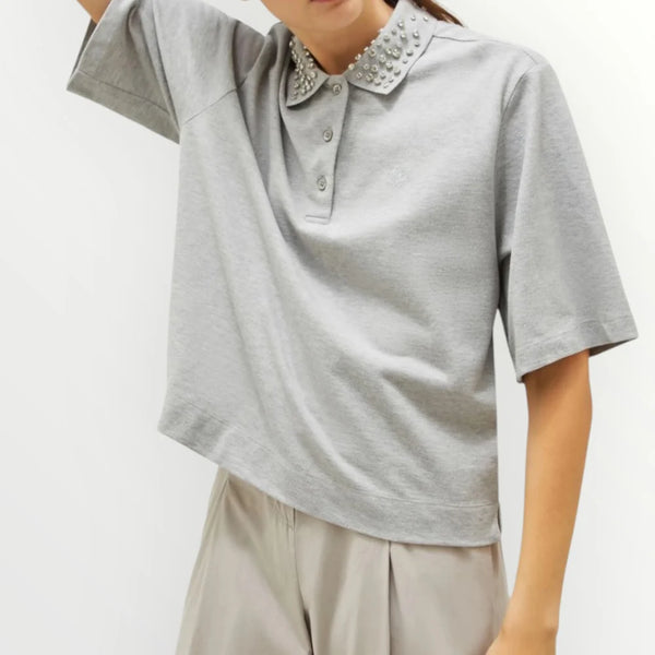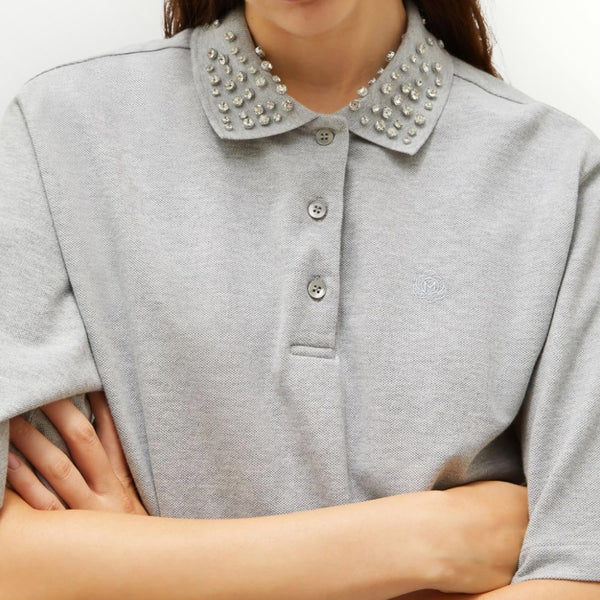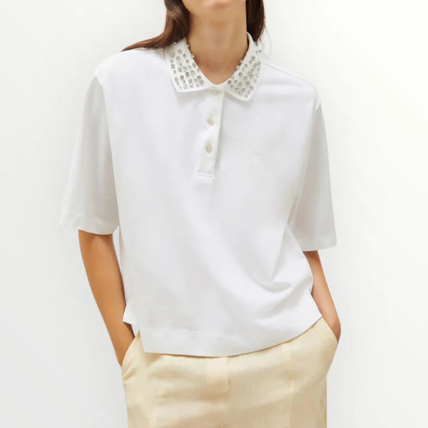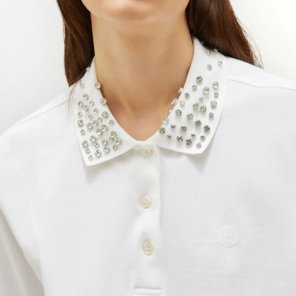 Polo in jersey piqué di puro cotone a fit dritto. Collo a polo con bottoncini e cristalli cabochon. Spalla scesa. Ricamo sul petto.