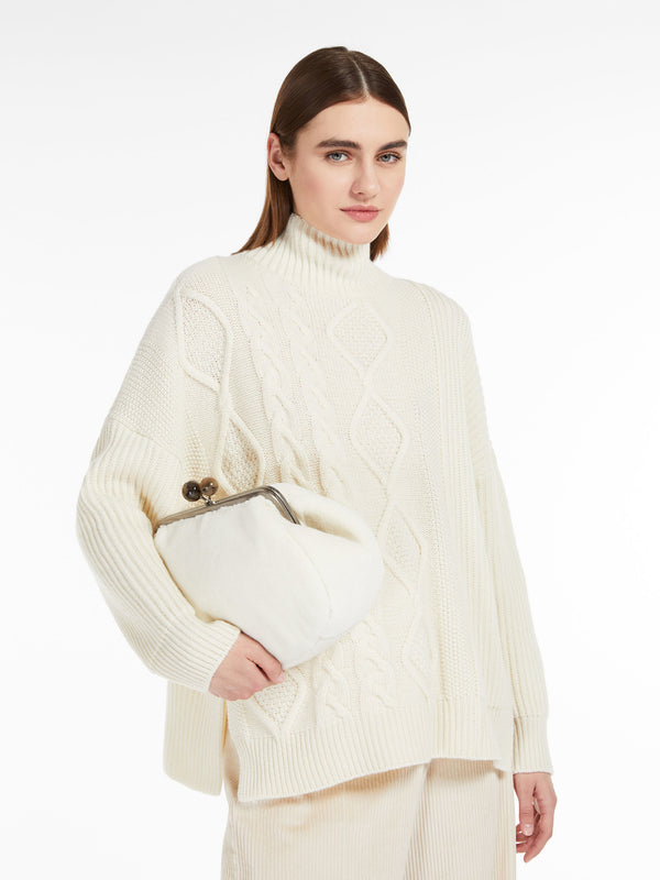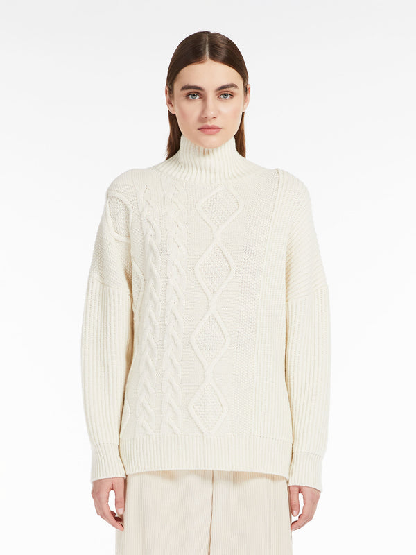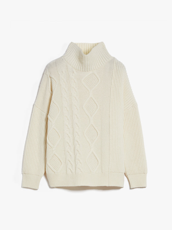 Maglia patchwork in filato di pura lana con collo dolcevita e maniche lunghe a giro basso. La lavorazione a coste e a trecce dona carattere alla texture. Lunghezza 70 cm.
