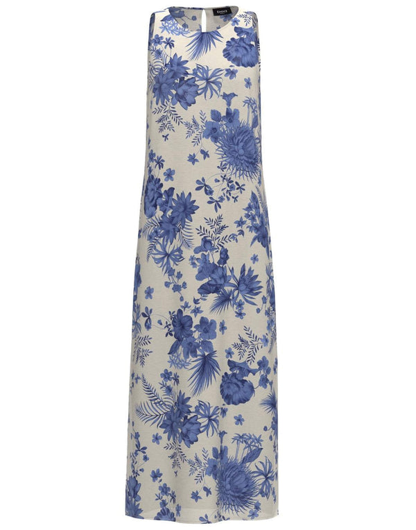 Una fantasia botanica bicolore è la protagonista indiscussa di questo abito in cotone e lino. La costruzione pulita, smanicata e dritta, lascia spazio alla stampa, in un mix di femminilità e tocchi poetici.