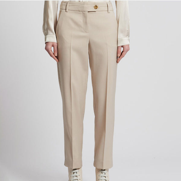 Pantaloni chino in twill di misto lana. Chiusura con patta coperta da zip e bottone, oltre a tasche alla francese davanti ea filetto dietro. Dettaglio piega stirata davanti e dietro. Il tessuto contiene fibre rigenerate di poliestere o poliammide ottenute da materiale plastico riciclato.