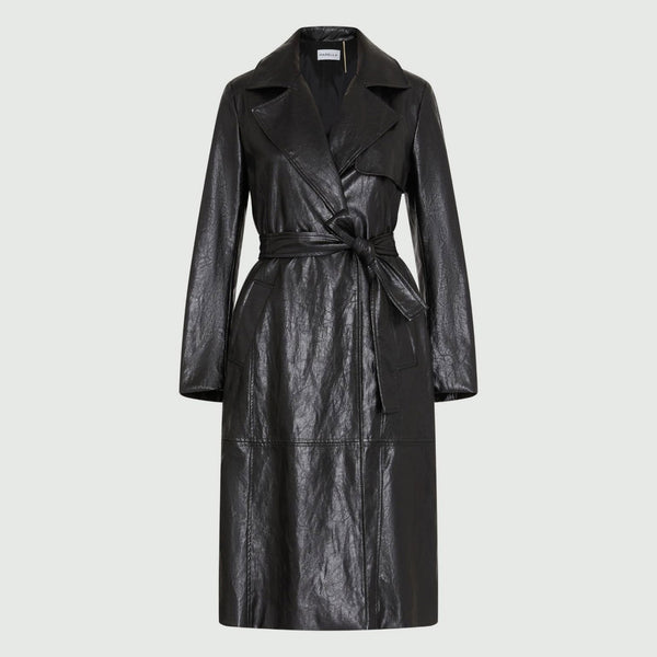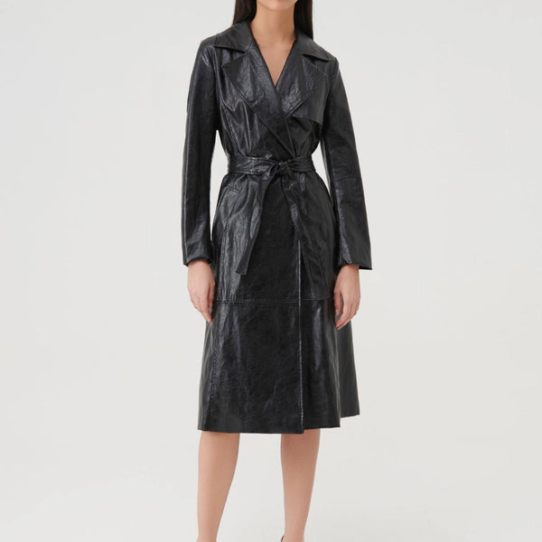 Trench in tessuto con effetto leggermente stropicciato, linea leggermente consumata. Collo a revers e maniche lunghe. Chiusura doppiopetto e tasche a filetto. Spacco centrale sul retro. Modello foderato. Cintura abbinata.