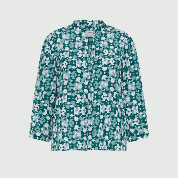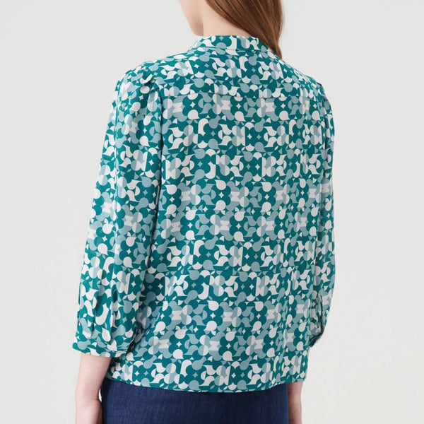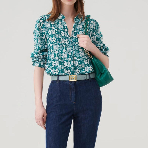 Blusa dal taglio morbido in crepe de chine di seta con dettaglio sulle spalle leggermente arruffato. Collo a fascia impreziosito da dettaglio a V e maniche a 3/4 impreziosite da polsini.