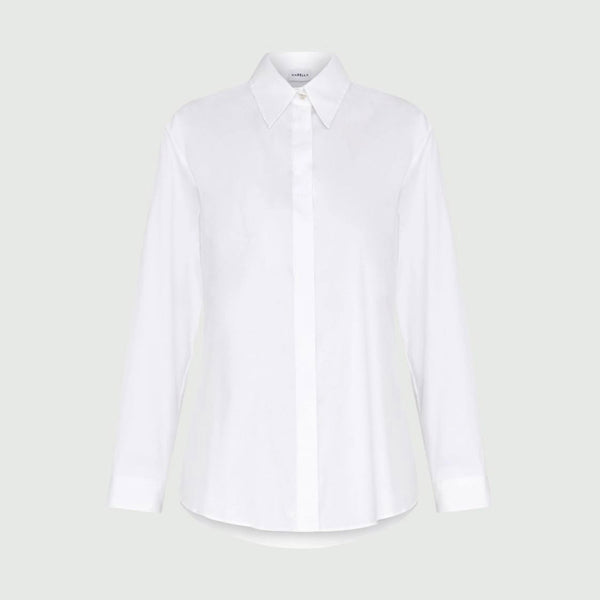 Camicia in popeline di misto cotone stretch, leggermente consumata. Collo a camicia, maniche lunghe con polsino. Chiusura con bottoni nascosti.