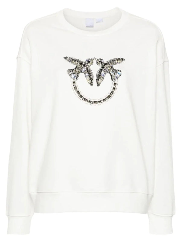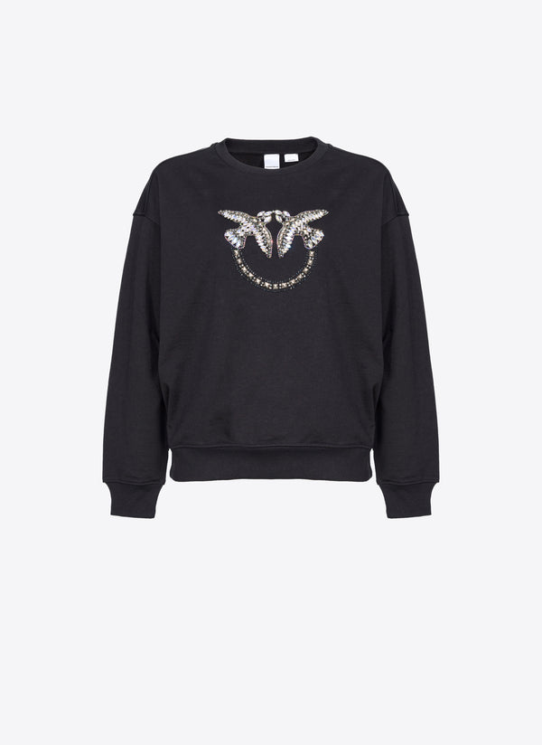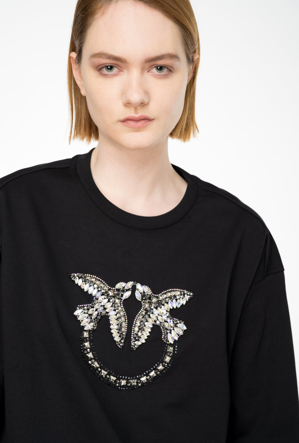 Felpa a maniche lunghe in morbido cotone con maxi ricamo gioiello Love Birds davanti completato da borchie. Scollo tondo, polsini e fondo capo con elastico.