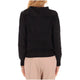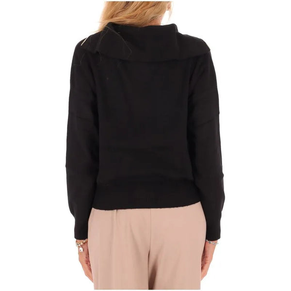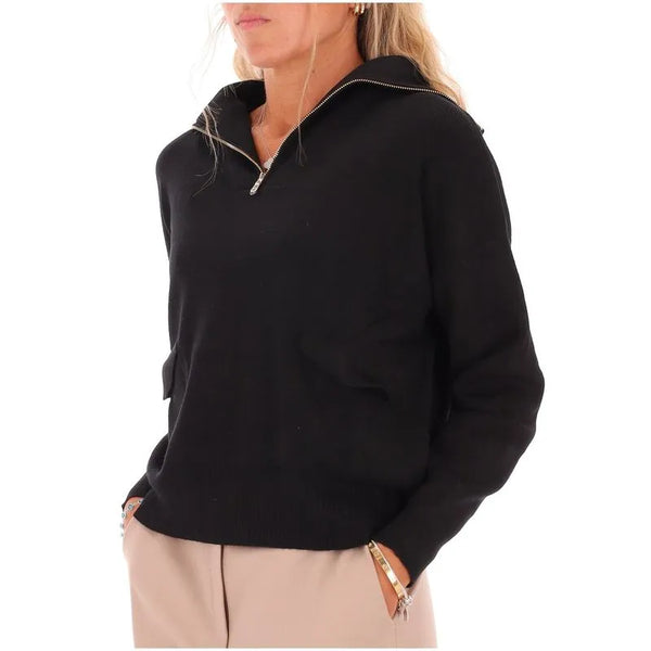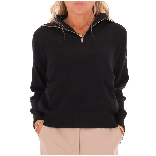 Maglia in misto viscosa con lavorazione a punti, linea over con bordi a coste. Collo a lupetto con zip, maniche lunghe con giro sceso e polsino. Finte tasche con patta.