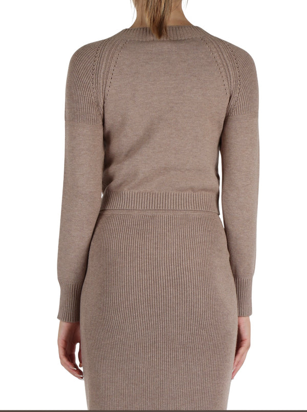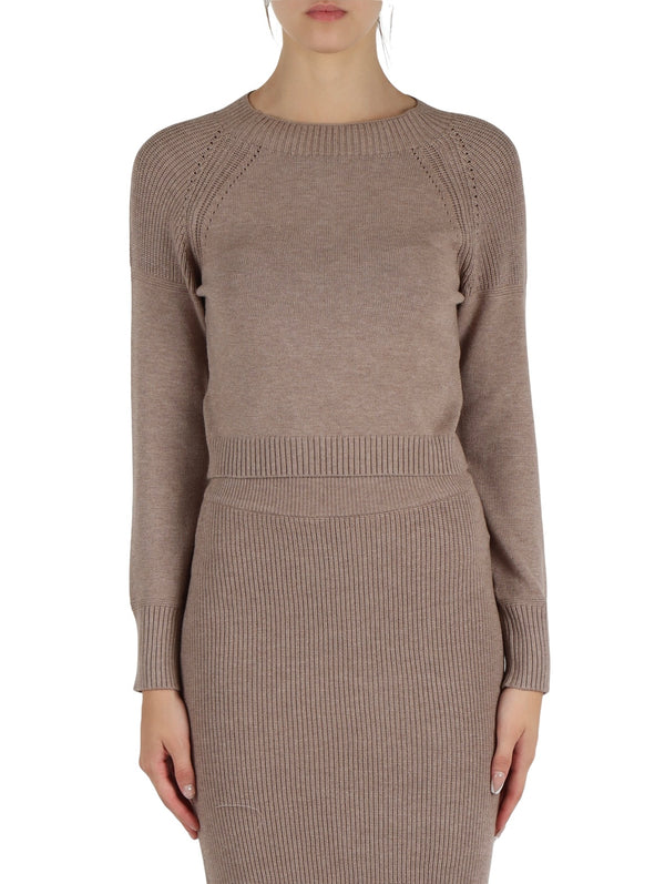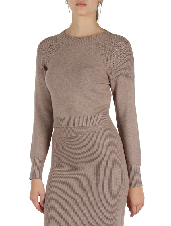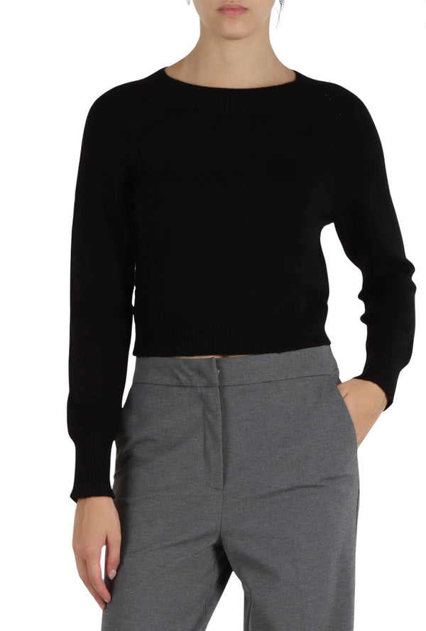 Maglia in viscosa lavorata, linea dritta con bordi a coste. Scollo rotondo, maniche raglan lunghe con polsino. Lunghezza 50 cm.