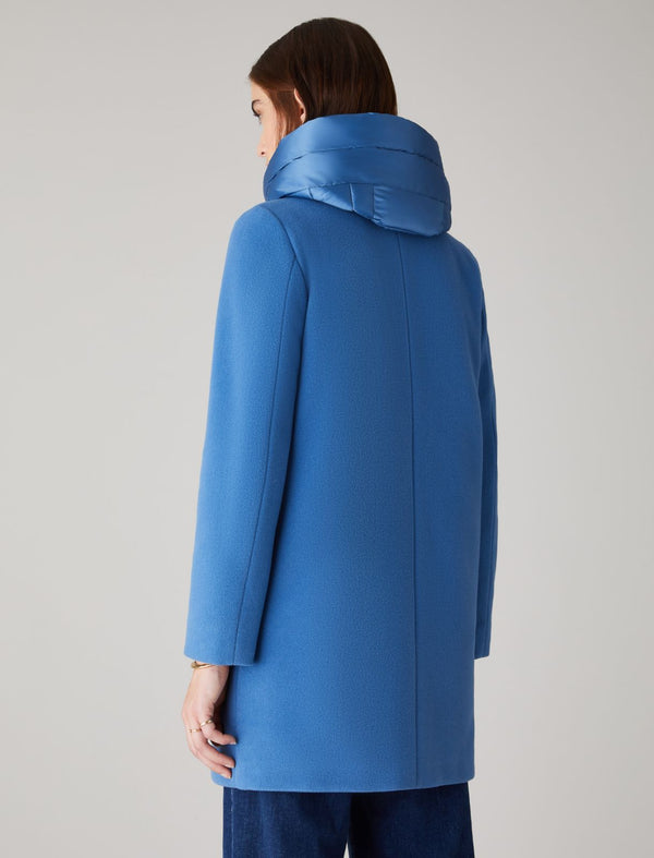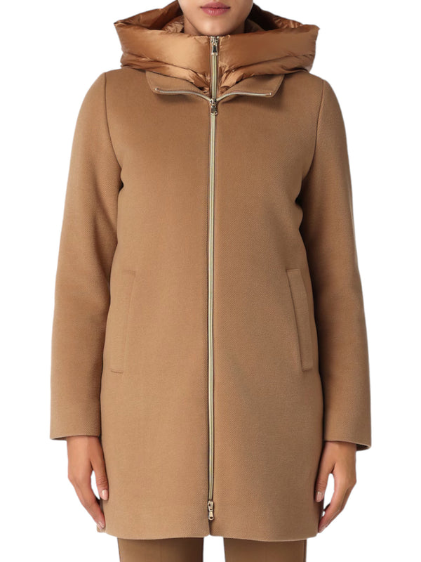 Il lato chic del piumino, da indossare anche con i look più eleganti. Minimal nei volumi e discreto nei dettagli, è rifinito con le zip dorate e la pettorina con cappuccio staccabile a esaltare la sua identità multitasking.