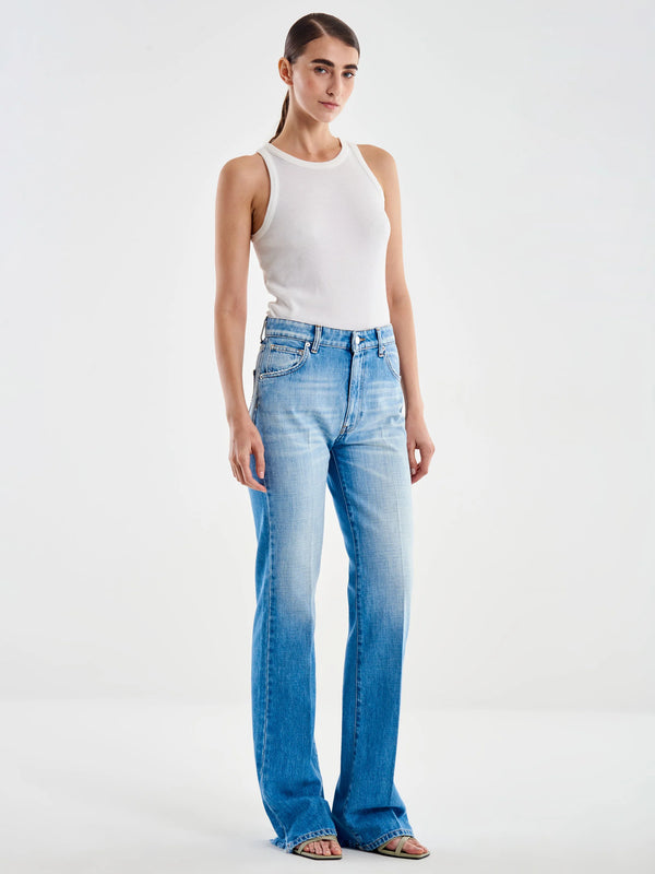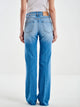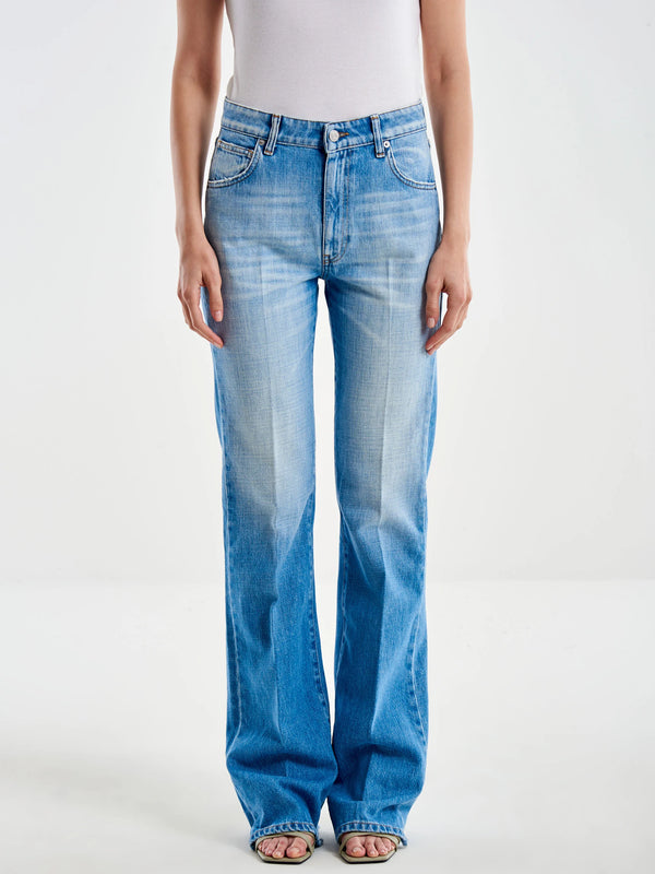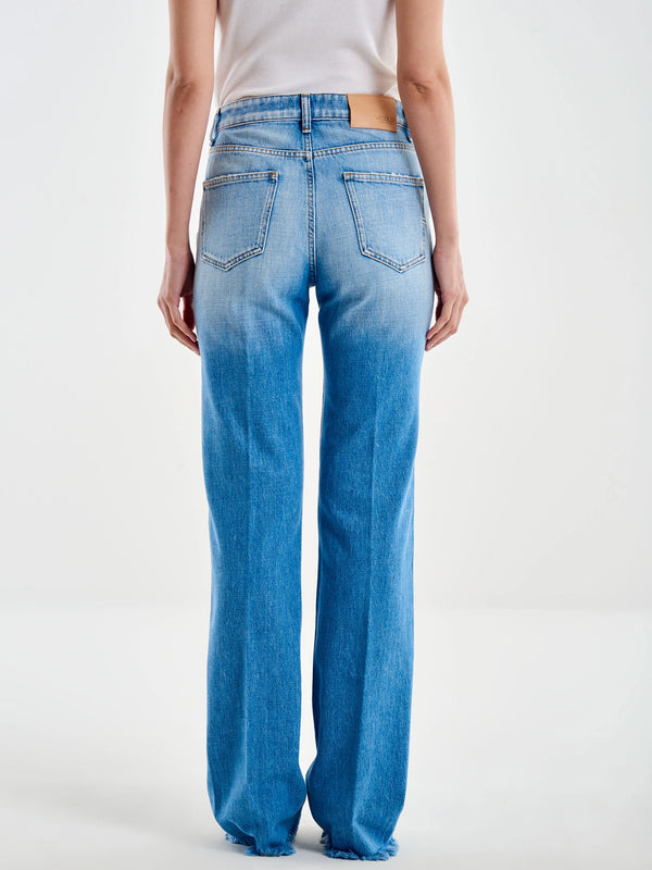 Jeans straight fit. Dettaglio modello cinque tasche. Chiusura con zip e bottone metallico. Denim sfumato con piega in stiro.