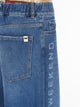 Jeans in denim autentico di puro cotone, caratterizzato da una silhouette con gamba ampia e lettering Weekend Max Mara laserato a contrasto lungo i fianchi. Modello 5 tasche con vita elasticizzata, passanti per cintura, baschina sul retro e rivetti in metallo. Label in gros grain con logo a farfalla sul retro. Chiusura con zip e bottone a chiodo.